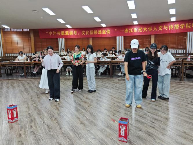 猜灯谜活动中,谜题设计巧妙融合传统典故与地域特色,“玉兔捣药”引经据典,“钱塘江潮”应景入题,既考验智慧,更传递文化,中外学子或凝神思索,或热烈讨论,破解谜底时的欢笑声此起彼伏。
