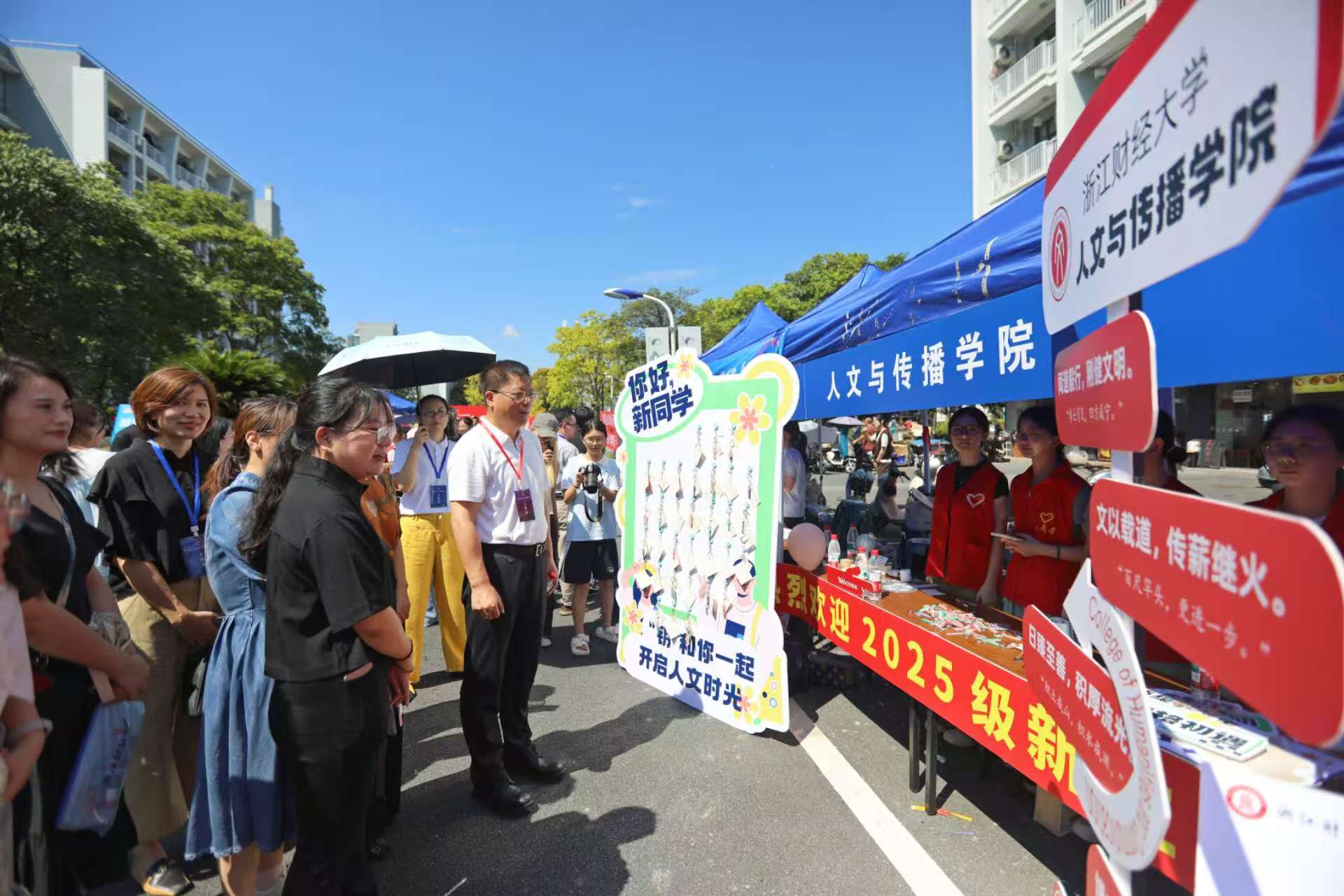 “同学,你是哪个专业的?”“报到还顺利吗?”魏江书记微笑着与新生及志愿者们交流,关心大家的专业选择与初入校园的感受。听到在场同学来自汉语言文学和新闻与传播学专业,他亲切地分享起自己大学时期担任学生记者、通过写作自食其力的经历,并勉励同学们:“文学是一辈子的内在美。” 他希望大家无论未来走向何种岗位,都要始终保持对文字的热爱,在文学的滋养中沉淀自我,让生命因读写而更加丰盈、温暖、有意义。