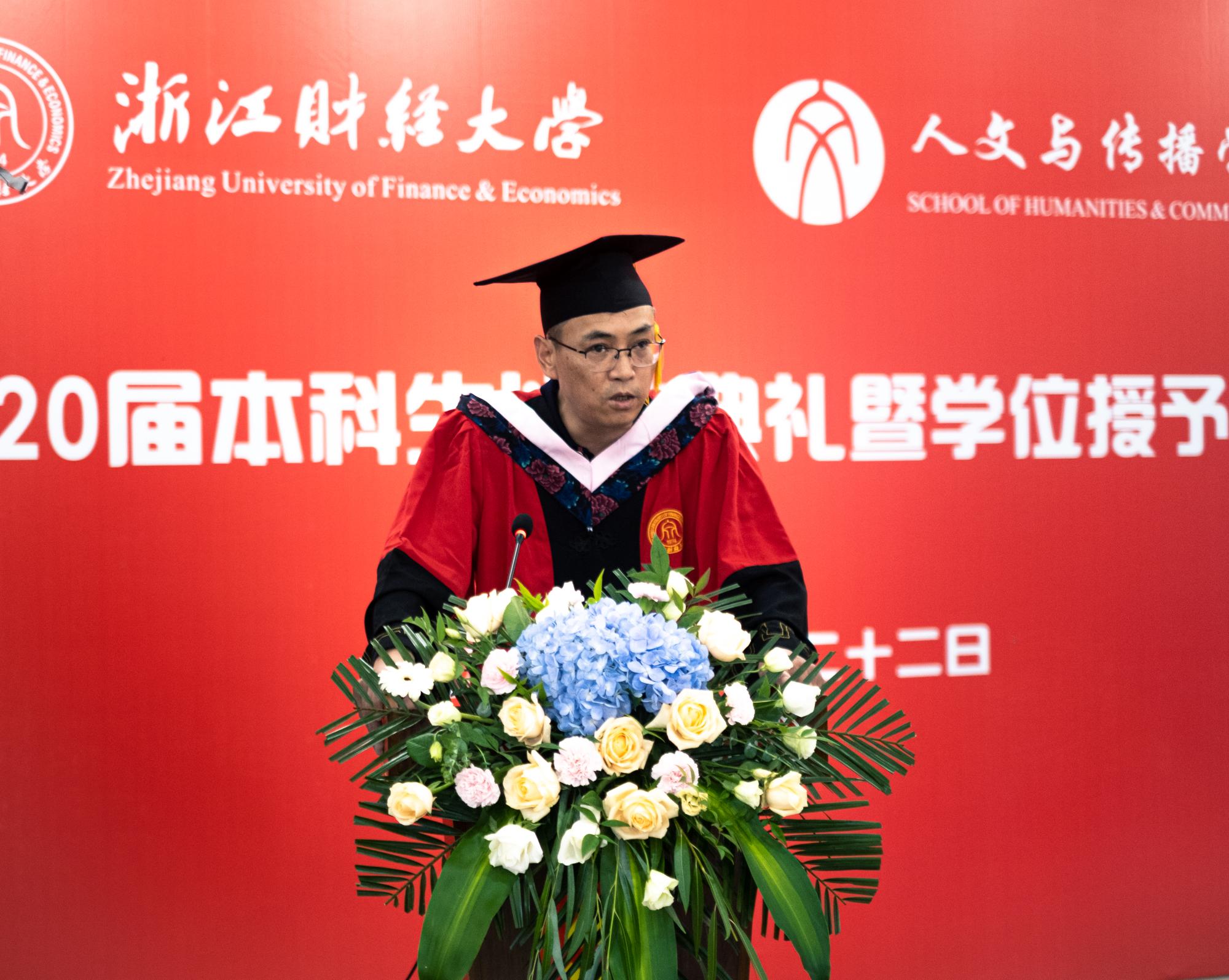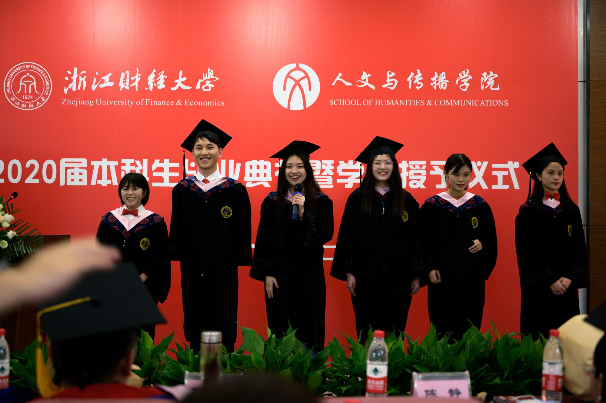 应届同学因为疫情面临更多的困难和不确定性,但从复旦大学、浙江大学、爱丁堡大学等世界名校升学,到腾讯、浙江中控等百强名企入职,我们依旧迎难而上成绩骄人。2020届毕业生汉语言文学专业陶娟、林滢、汉语国际教育专业舒昊、广告学专业邵珏书婷、赵雅雪、数字媒体艺术专业刘琦作为优秀毕业生代表上台向学院报告。“我将铭记住‘进德修业,与时谐行’的校训,也会记住我们‘为往圣继绝学,为万世开太平’的人文之光。”