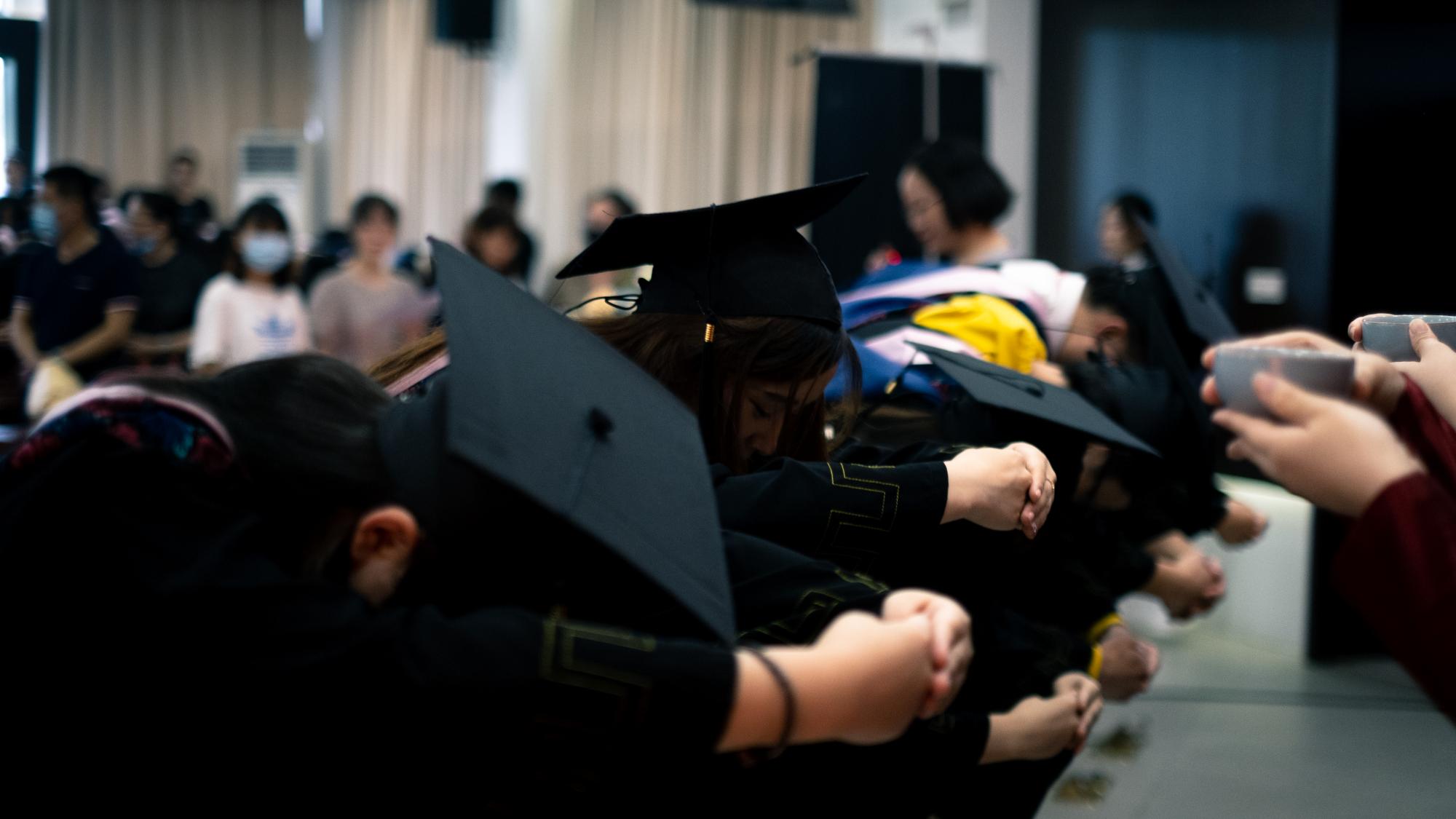 周保欣、高燕和陈静三位老师身着导师服上台,毕业生以三人为一组,走到老师前鞠躬致谢。老师与受礼的毕业生彼此握手,颁发学位证书。毕业生双手低头接过,老师将其学士帽右侧的流苏拨至帽左。从左到右,一个温柔轻缓的微动作,里面有着长辈欣慰莞尔,有着后辈的欢欣雀跃。