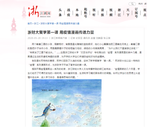 教师胡江在专业教学中,带领学生开展“疫情”系列漫画创作活动,带动广大学生积极创作,发挥创意,表达大学生在疫情下的所思所想,通过生动的形象和有趣的创意,为返校复学的大学生们传递防疫知识与抗疫精神。目前,已有三十多幅优秀漫画被展出,部分作品已被《人民日报》漫画增刊选录。