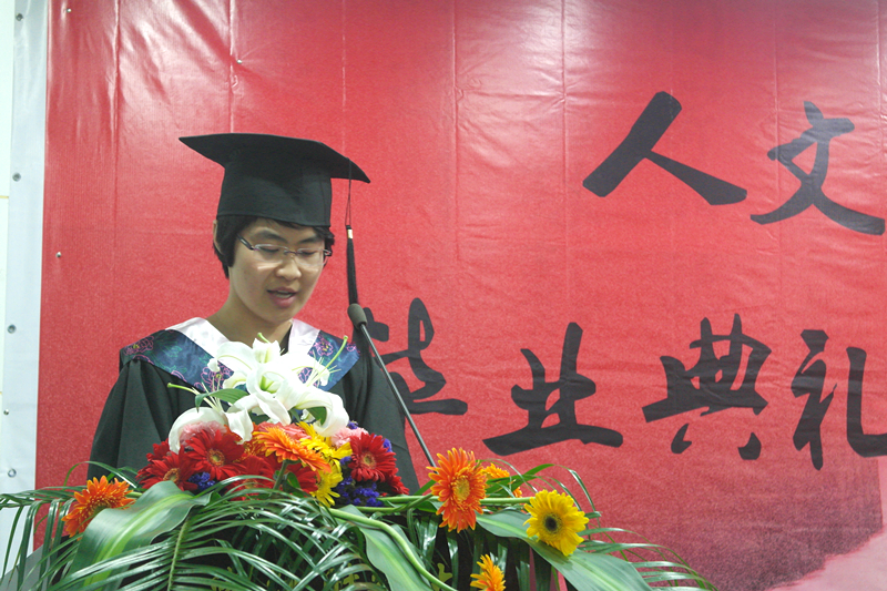 伴随着国歌声,毕业典礼仪式拉开了序幕。首先,院长何华珍致辞,代表学院表达了对毕业生们的殷切期盼之情。教师代表许宏香发言,积极鼓励大家在未来的岁月中尽快找到自己努力的方向。而09毕业生代表张嘉琳的发言,则是道出了在场所有毕业生们对学校、学院的不舍及对老师的无限感激之情。随后党总支副书记高燕和副院长姚红分别宣布了省级、校级和院级优秀毕业生名单。宣读完毕,出席的领导依次为获得“浙江省优秀毕业生”、“浙江财经大学大学优秀毕业生”称号的毕业生颁发证书。紧接着进行的便是庄严肃重的学士学位授予仪式。参加典礼的毕业生们,个个身着黑色学士服,头戴学士帽,依次走上前台,出席领导为他们颁发学位证书,给予他们真诚的祝福并亲切地为他们扶正流苏。这一刻毕业生们脸上洋溢着幸福的微笑,是对他们四年来大学生活的最好肯定。