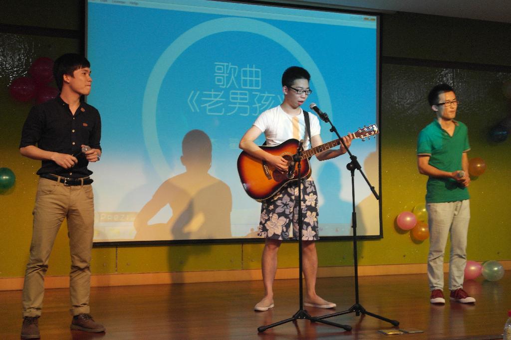 之后极具青春活力的街舞表演,“左手姐妹,右手兄弟,中间爱情”的歌曲串烧,杨道胜同学献唱的《海阔天空》,以及姜岳斌老师一曲精彩的《Scarborough Fair》将全场气氛推上高潮。