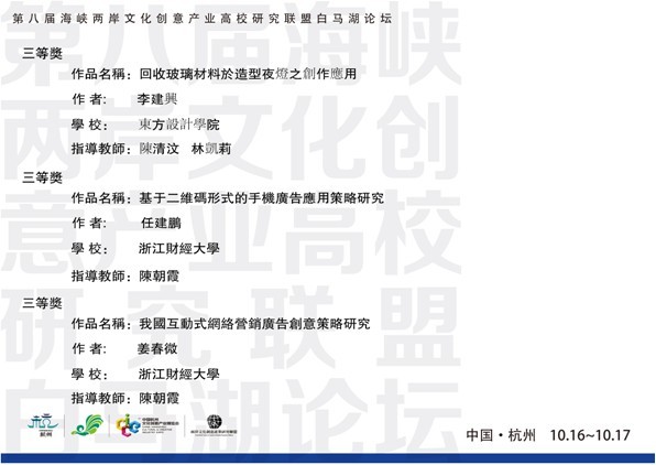 本次论坛首次设置“华夏青年学子创意大赛“优秀作品评选和展示活动,由两岸具有权威的专家学者匿名评选投票。本次大赛设理论研究类、平面设计类、动画短片类各一等奖一名,二等奖两名,三等奖三名。360直播足球