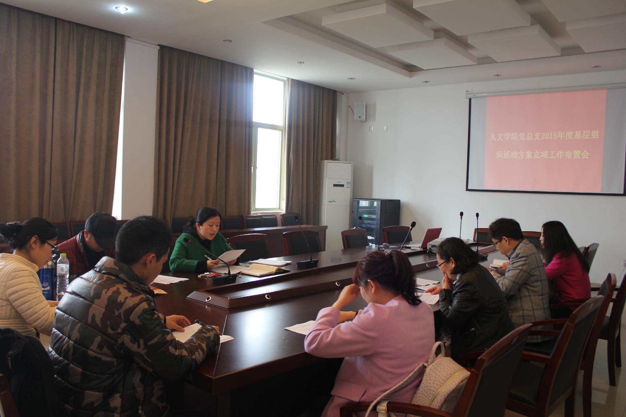 在7-404会议室召开了党支部书记会议,布置关于开展2015年度党组织活动立项工作。学院全体教工支部和学生支部书记参加了会议,会议由人文学院党总支副书记(主持工作)高燕主持。