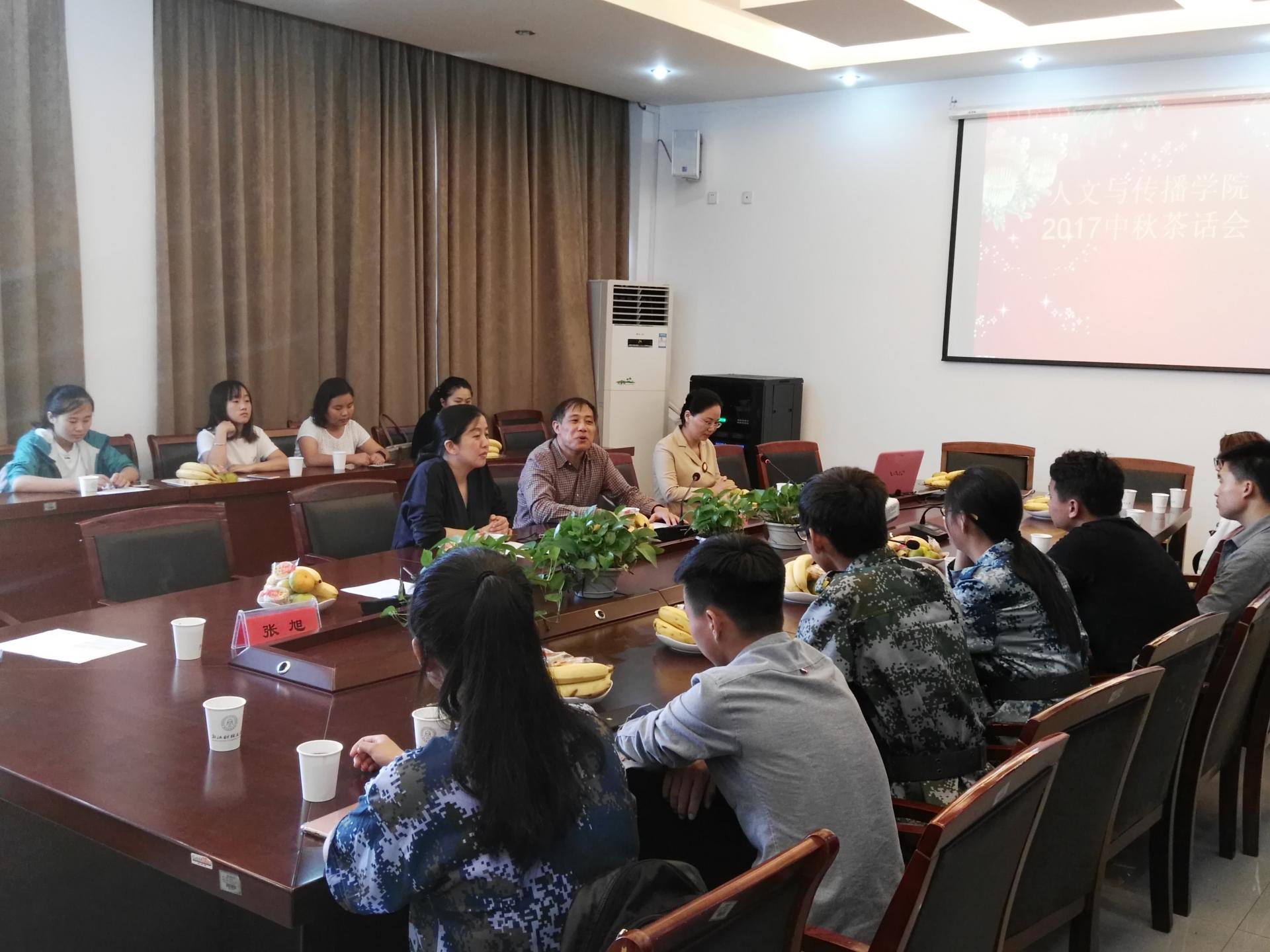 在学院楼404会议室举办了2017中秋茶话会,院长何华珍老师、院党委书记高燕老师、数字媒体系胡江老师、汉语国际系刘亚辉老师、辅导员及学生代表20多人欢聚一堂,喜迎佳节,茶话会由高燕书记主持。