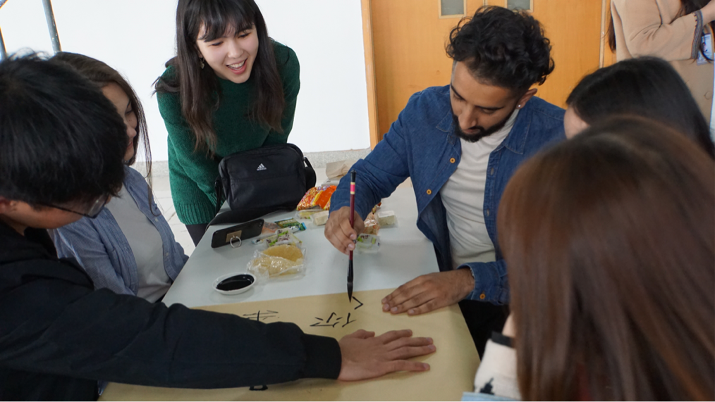 在文化交流方面,汉语国际教育专业的同学们准备了毛笔、墨水等书法用具,让留学生们现场学习书法知识,尝试汉字书写。汉语国际教育专业的学生在该活动中获得了对外汉语教学的体验和感悟;而留学生在书法体验中直观感受到了中华文化的传统魅力与内在气韵。活动最后,一位留学生朋友主动为大家表演魔术,再次将全场的气氛推向高潮。