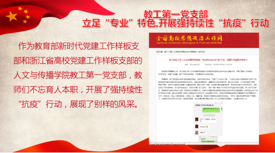 党委充分发挥各党支部专业特长和战斗堡垒作用,号召师生党员积极投身抗“疫”斗争,先后涌现出吴智斌、姚晓萍、杨建忠、何冬学、陈金柱等优秀师生党员典型。同时,各党支部利用专业特长,开展了富有人文特色的抗“疫”活动和教育实践,传播了正能量,提升了师生党性修养,为疫情防控作出积极贡献,相关事迹先后受到高校思政网、新浪网、浙江新闻网、浙青网、浙江财经大学官方媒体的报道,取得了良好的社会效应和教育效应。