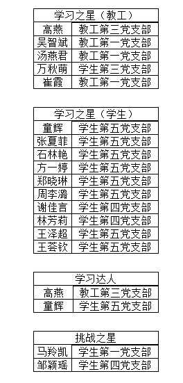 表彰会上,对17名“学习强国”学习中表现突出的党员进行表彰。对2021年度总积分排名各居前5名和前10名的师生、“四人赛”累计获胜局数排名各居学院第一名的师生、“挑战答题”中得分各居学院第一名的师生分别授予“学习之星”“学习达人”“挑战之星”荣誉称号,并颁发了奖杯及奖状。