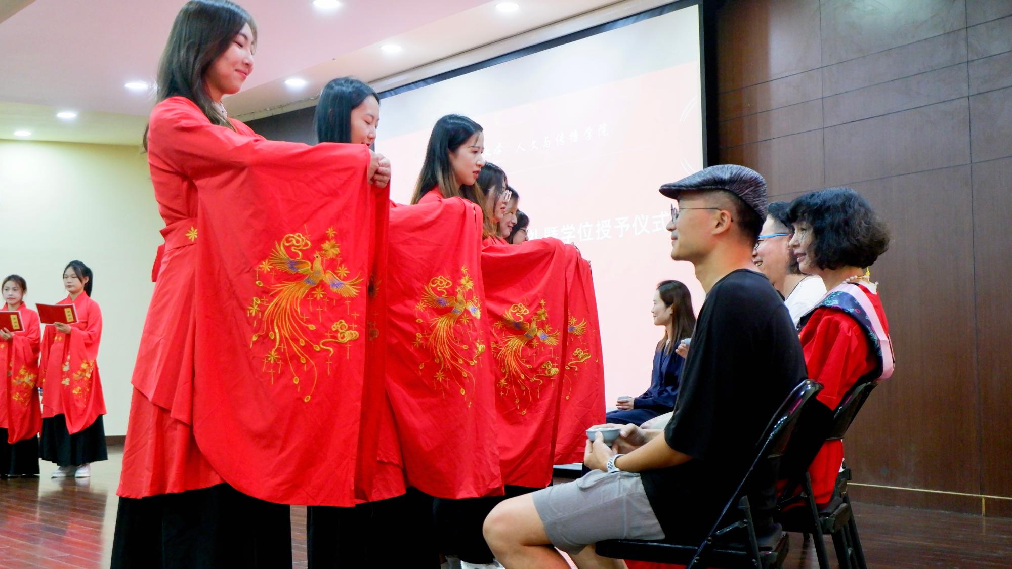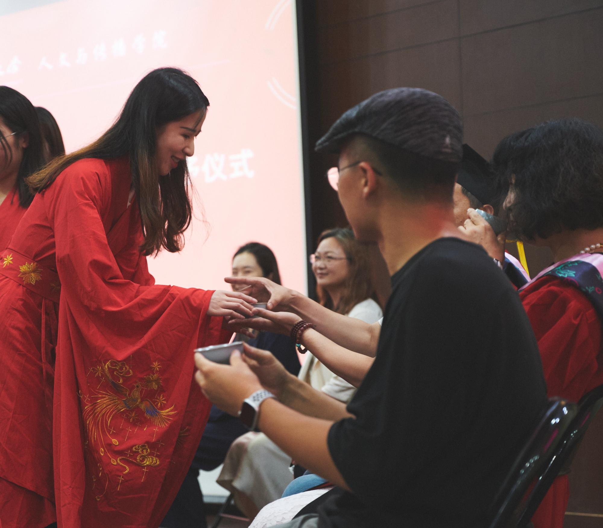 “饮水思源,成才念师。”四年光阴虽短,然师恩永存,感恩师栽培,今以礼谢之。在典礼上,教师代表赵顺宏、汤燕君、胡梦颖、史婷婷、董建华、洪艳、王阿蒙老师上台,接受七位毕业生敬茶,全体毕业生双手握于胸前,面师而立,行三拜之礼。小小的一杯茶、一行礼,饱含着毕业学子深深的感激之情。