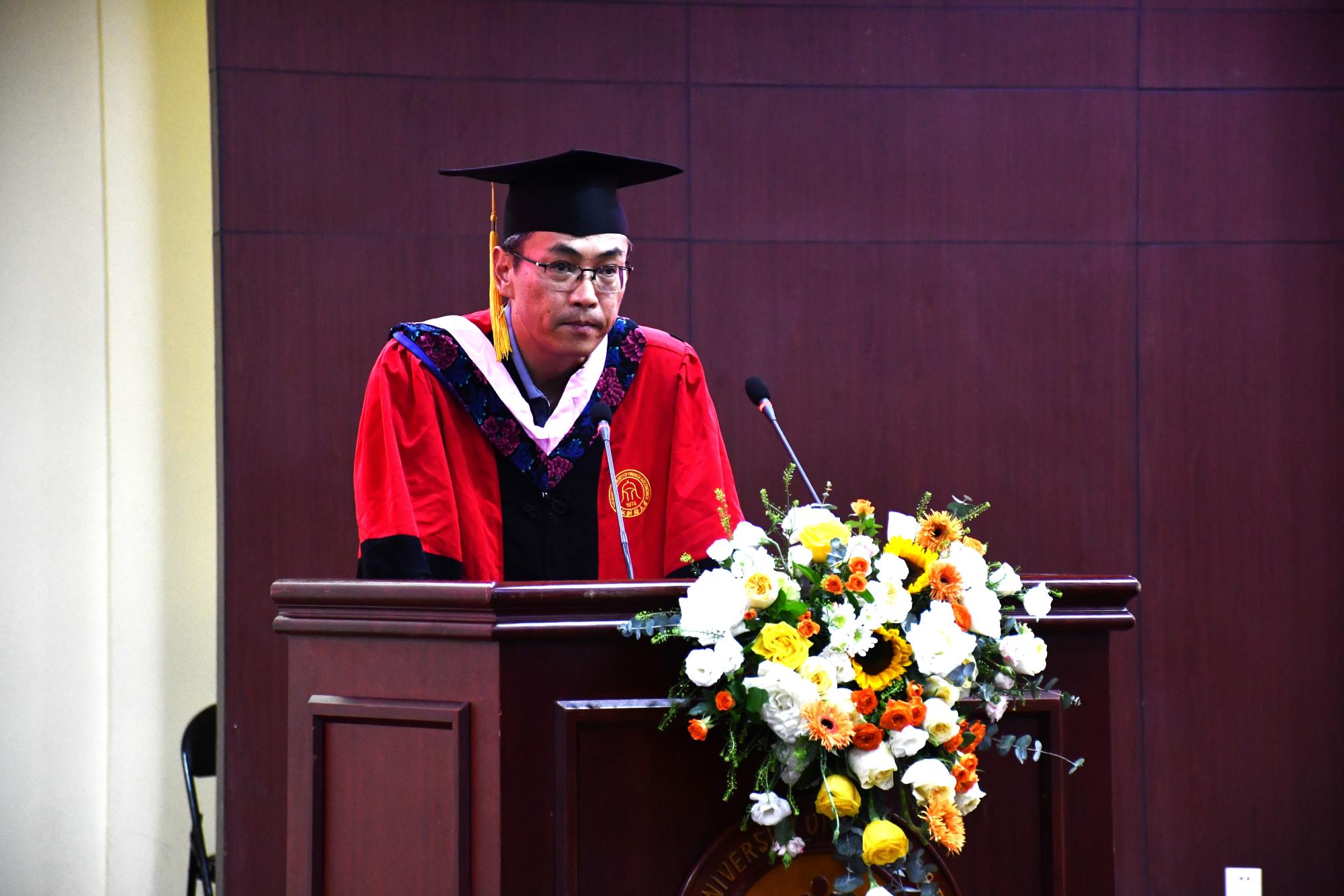 毕业典礼由院长周保欣教授深情的致辞开场。他首先祝福圆满完成学业的毕业生们毕业快乐。随后周院长提及了同学们最关心的就业难题,他鼓励那些对自己未来依旧迷茫的同学:“奥地利诗人里尔克说,‘没有什么胜利可言,挺住意味着一切’,而我要说的是,没有什么失败而言,挺住意味着一切!”在这个不确定的疫情时代下,周保欣院长希望每一位毕业生都能听从自己的内心,保持与父母、老师和朋友的沟通与协商,不害怕选择和困难,在勇气的选择和困难的克服中跨域人生道路上的障碍。最后,他以“祝你们好运!”深情地表达对同学们的嘱托与祝福。