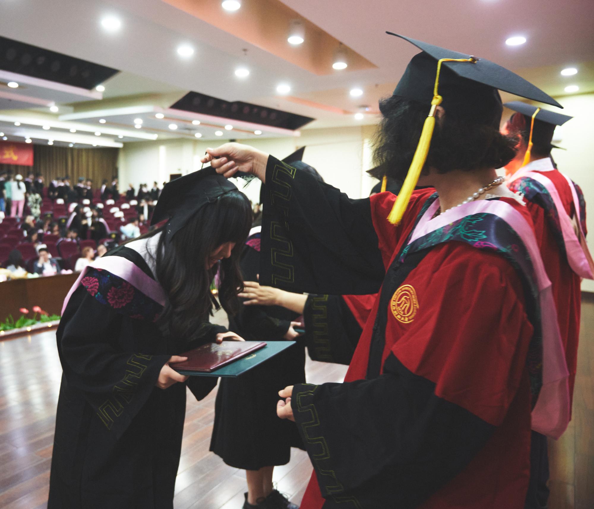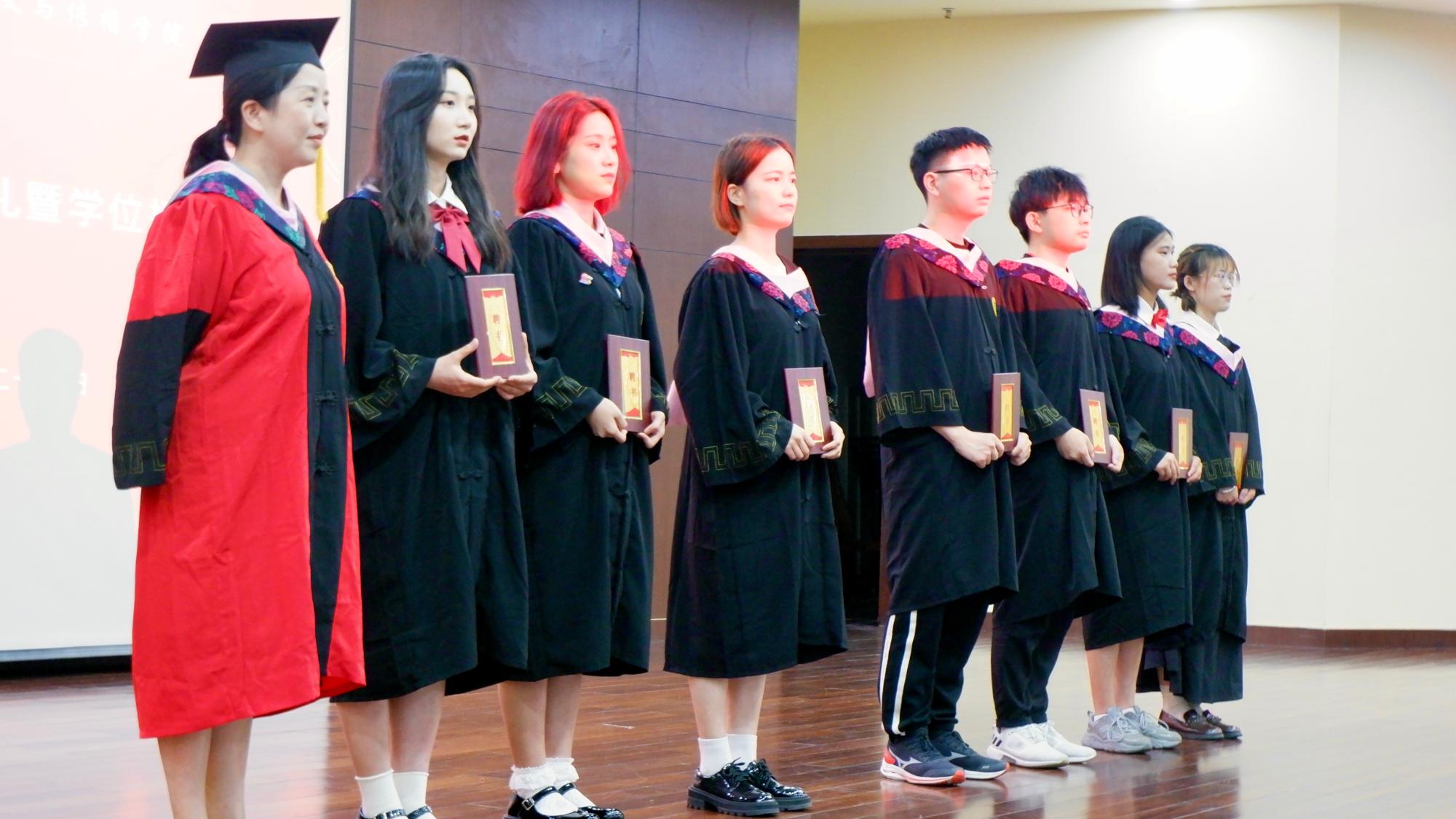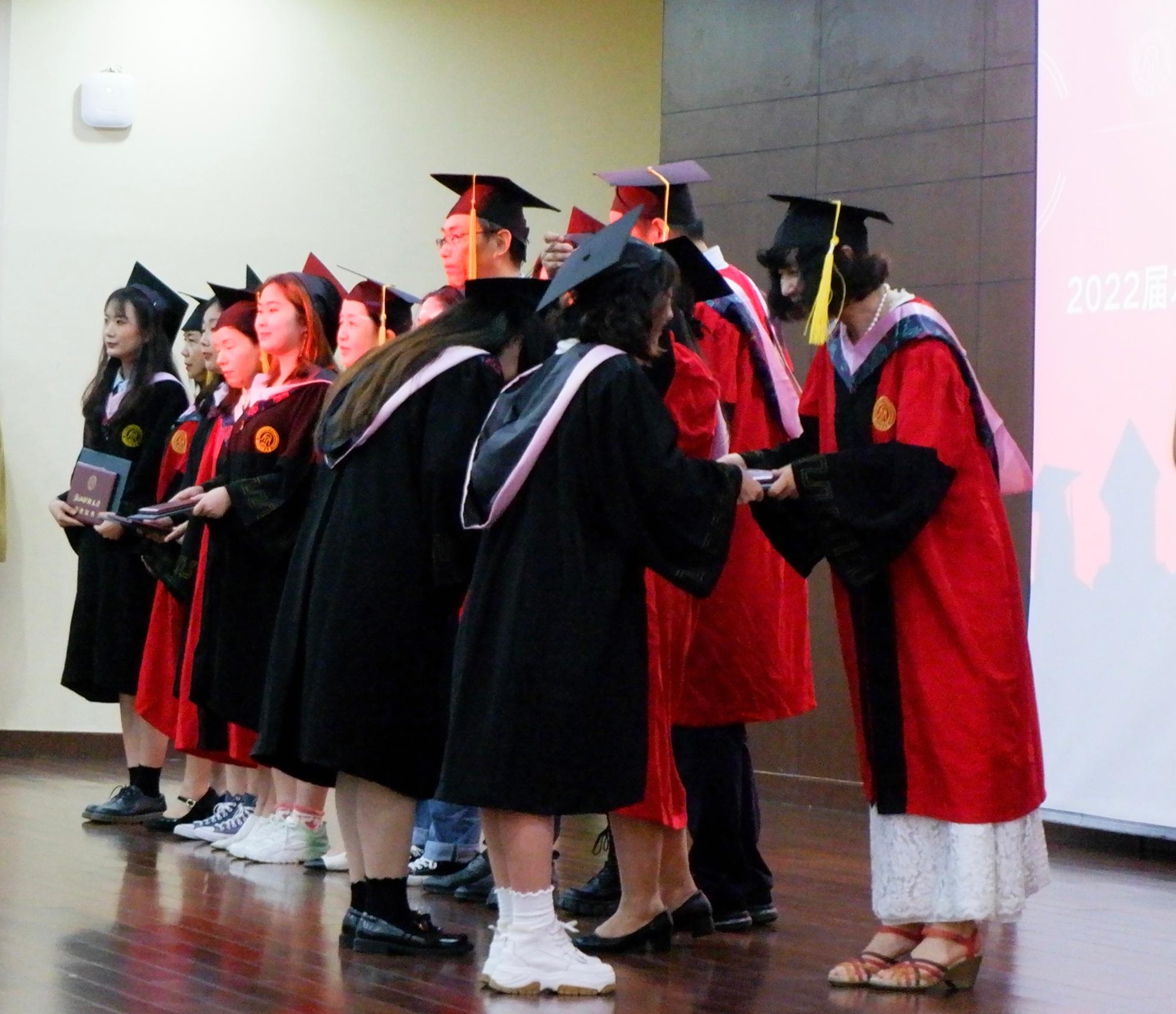 周保欣、高燕、陈静、吴智斌、赵顺宏、陈朝霞和洪艳七位导师身着导师服上台,毕业生以7人为一组,上台与导师们热情地握手拥抱,微微低头,让老师将其学士帽右侧的流苏拨至帽左。同学们接过导师们颁发的学位证书和毕业证书,扶苏拨穗、美好定格,学院用这种庄重的仪式感,为毕业学子们的大学生涯,画上一个圆满的句号。2022届毕业生的人生新征程,由此开启。愿有前程可奔赴,亦有青春可回首。
