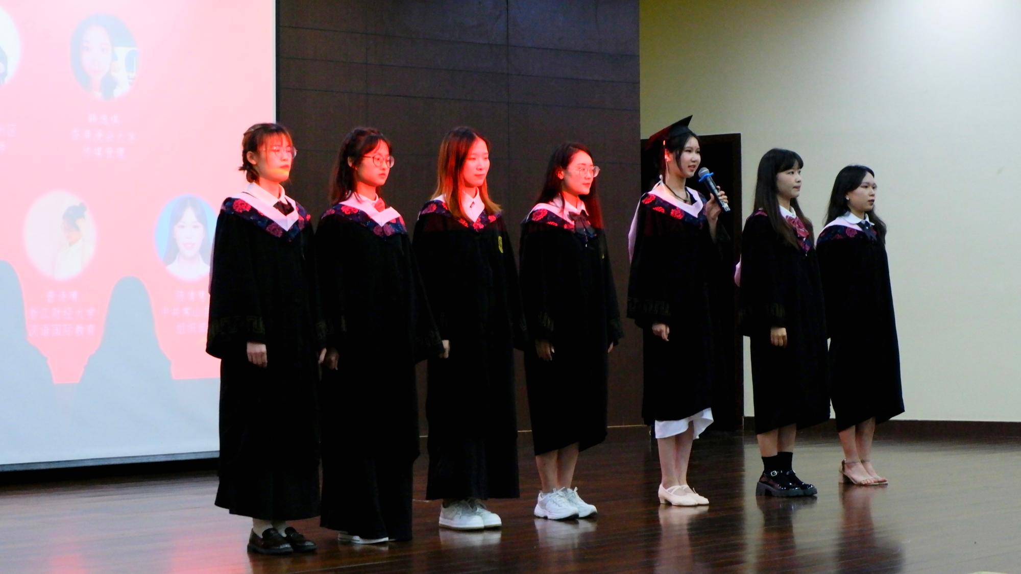 在毕业典礼上,汉语言文学专业的徐欣欣、茅益佳,广告学专业的韩逸祺,数字媒体艺术专业的孙航宇,汉语国际教育专业的陈阳,汉语言文学c班的曾诗晴、陈倩慧作为优秀代表上台向学院报告,并表达了对学院的祝福和期待。