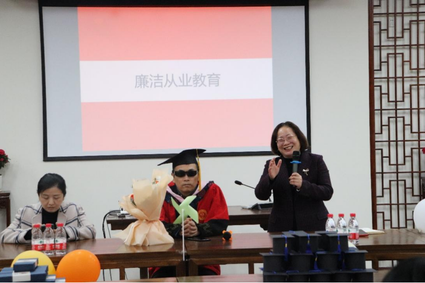 明朝即长路,惜取此时心。周院长和高书记代表学院为毕业生送上学院专属定制礼物,表达学院对毕业学子的深切关心。随后袁老师为毕业生开展了廉洁从业教育,以期毕业学子在未来工作与生活中循梦而行、向阳而生。伴着最后的师生交流活动,毕业座谈会慢慢接近尾声,毕业生与昔日深切教诲的老师回忆美好,畅谈未来。