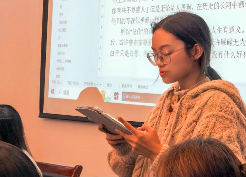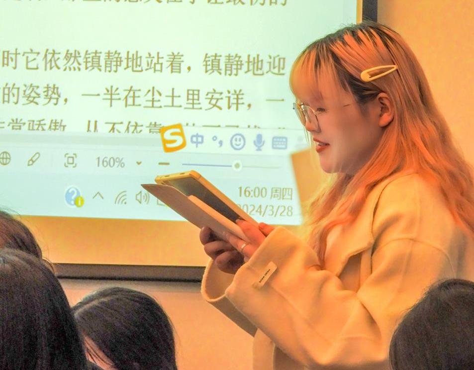 活动上,随机抽选同学朗诵本次活动中优秀作品的选段。在或慷慨激昂,或婉转悠扬的诵读声中,同学们沉浸书页间,感作者之感,悟文本之意。高翔同学的《纯粹》以哲理性出彩,吴师羽同学的《斑鸠夜话》独具匠心共同获得最高票数。
