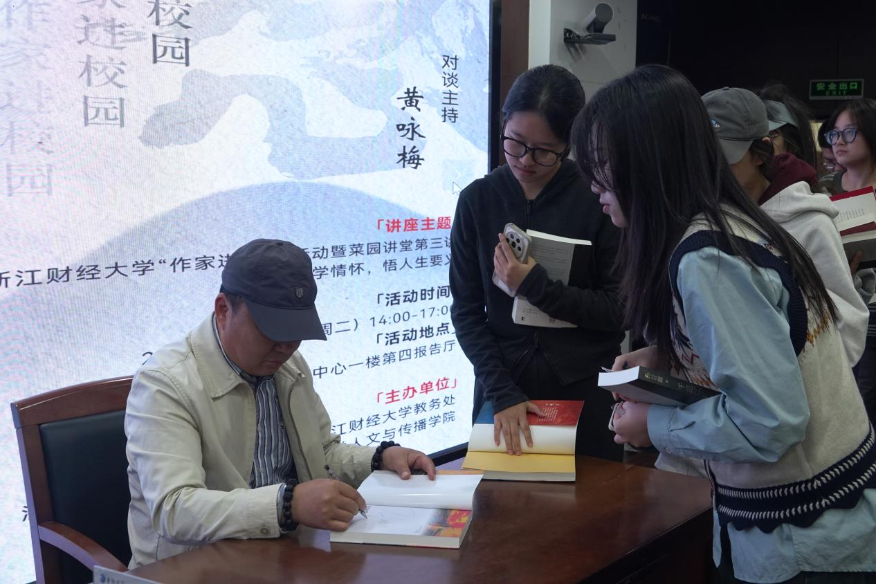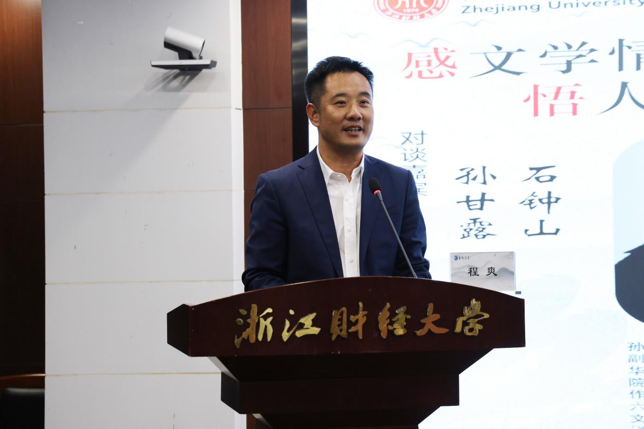 程爽副书记在致辞中表示,高校是人才培养的重要基地,推进社会主义文化强国建设是高校义不容辞的使命。当前,学校正在大力实施“新财经战略”,致力于培养MAQ型“完全之人物”的“浙财金生”,“作家进校园”活动是拓宽学生文化视野、提高文学素养、满足青年学子对高品质文学需求的重要举措。他表示,经典的文学作品不受到时间的约束,会在一代代人心中绽放光彩。两位作家的文字充满着生命的力量,作品中体现的坚毅、勇敢、真诚等品格,正是当前数字经济高速发展的时代迫切需要的精神特质,希望此次活动,能进一步丰富学校的人才培养模式,促进校园文化建设,以文培元,滋养心灵,为大家提供更加丰富的精神养分,促进学生全面发展。