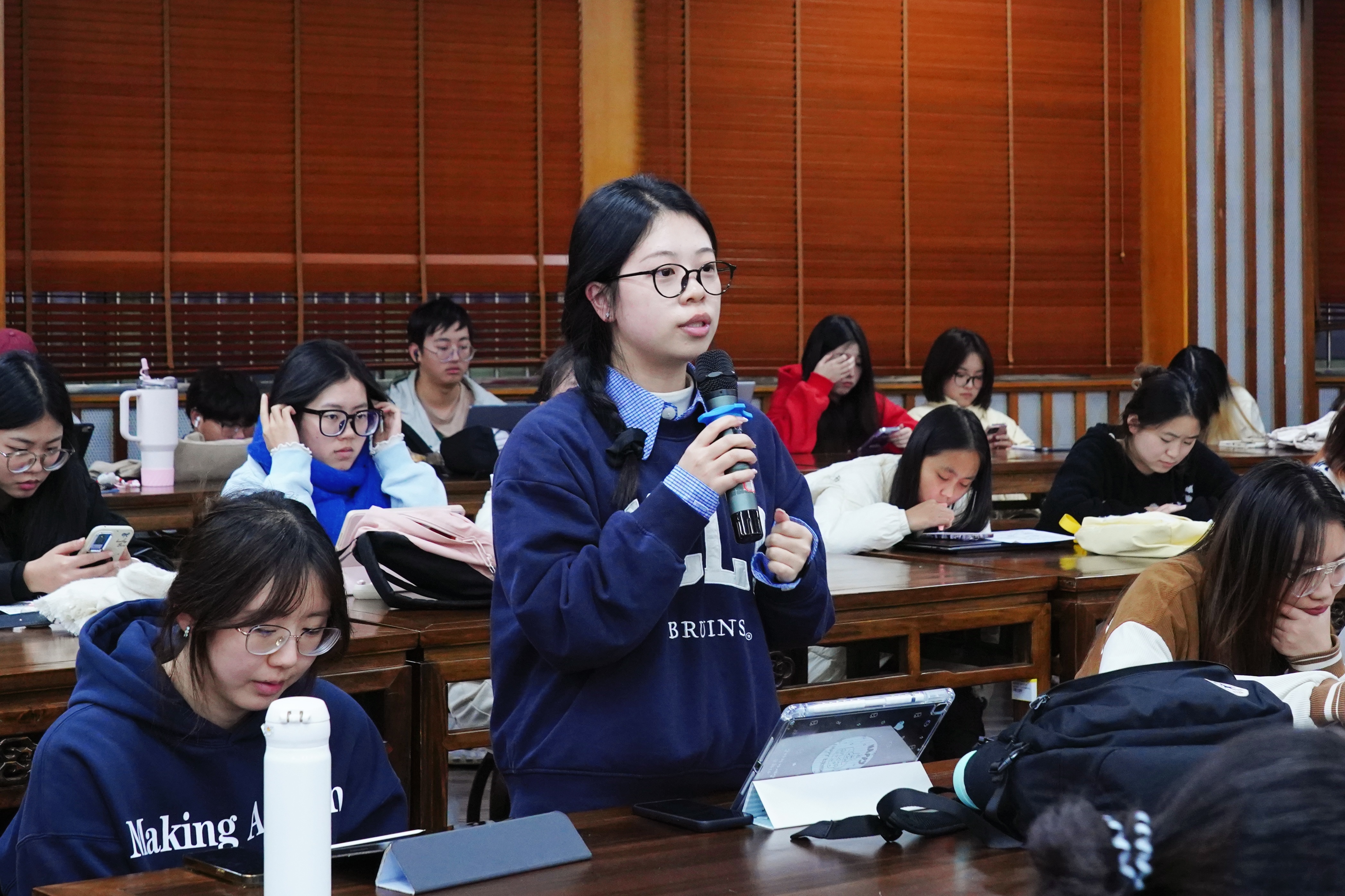 学生就《耕织图》人伦情感与现代文明的工具理性之间的协调关系、《耕织图》为何而作等问题,关于学生们的提问,臧军教授也耐心倾听,并一一细节做了解答。