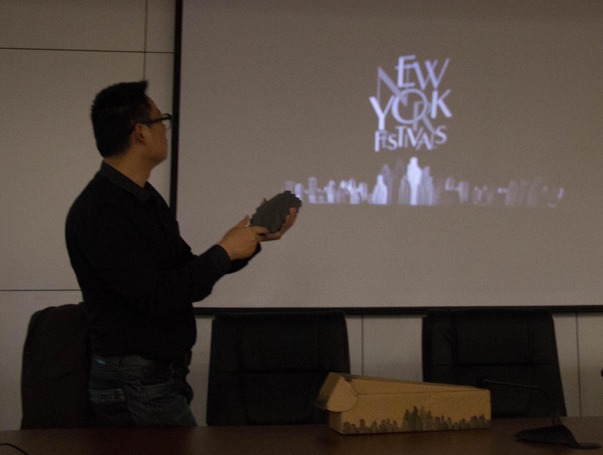 最后,吴老师向大家展示了纽约广告节金奖的奖杯,并勉励大家广告的创意源于生活,要对生活时刻充满热情,善于思考,记录生活中的点滴。