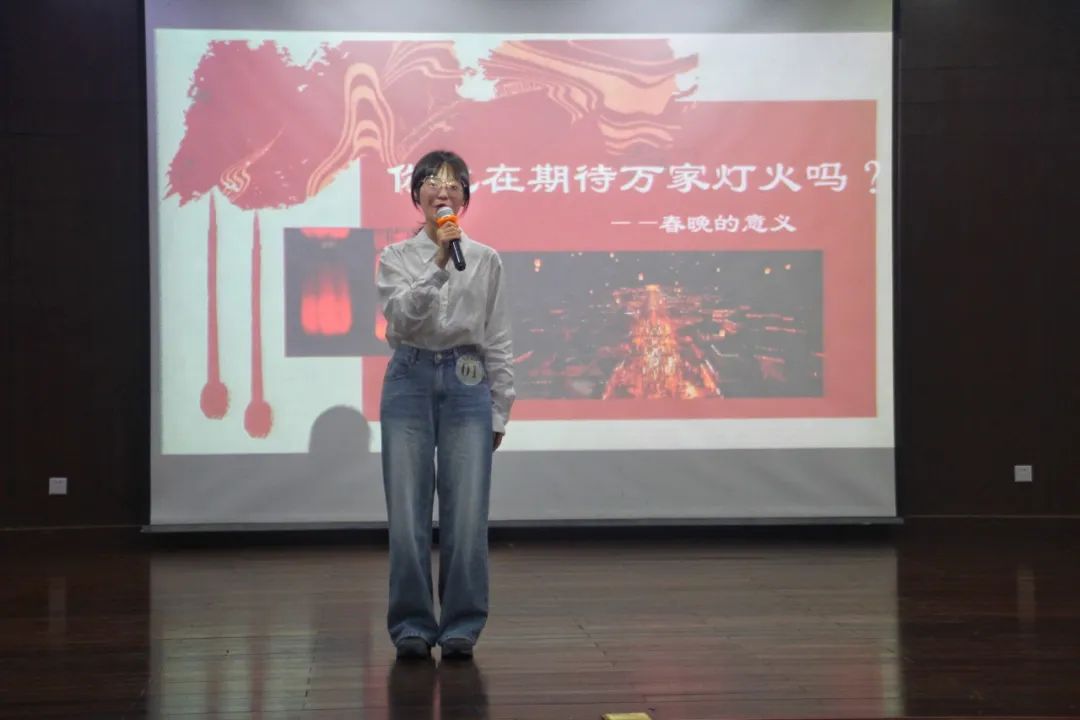 杜雨纹选手带来的是《岁岁年年只此时,欢欢喜喜共团圆》。她用每年春晚的主持人来开场,结合童年回忆,通过人们对春晚态度的今昔对比,抒发出她对春晚意义的思考:凝聚千家万户,情感共鸣。