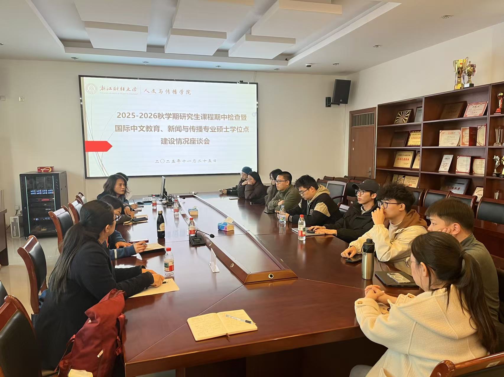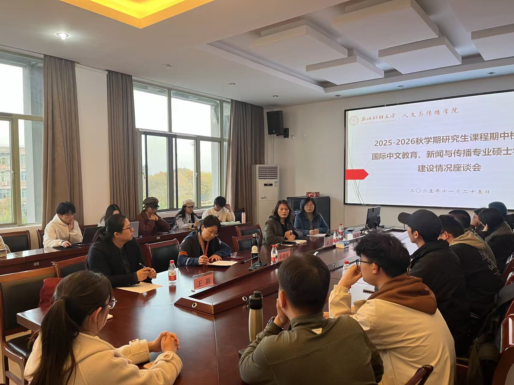 根据学校2025-2026学年秋学期研究生课程期中考核和教学检查的工作安排,我院于11月25日下午16:00在学院楼404会议室召开本学期的研究生座谈会。本次座谈会邀请到了研究生院督导余清萍教授,学院分管领导毋丹副院长参加并主持本次座谈会,国际中文教育负责人付伊副教授、新闻与传播专业硕导王颖副教授、研究生秘书以及学院24、25级各专业研究生代表20余人参加了座谈会。