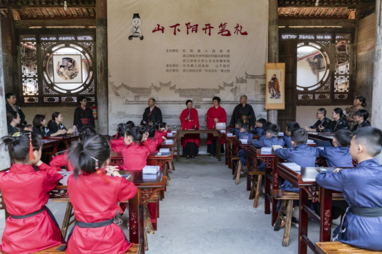 本次开笔礼由松阳县人民政府,浙江财经大学中国乡村振兴研究院、人文与传播学院共同主办,县教育局、县文化广电旅游体育局、古市镇人民政府和山下阳村承办,由浙江财经大学“中华古礼”博士团具体执行。