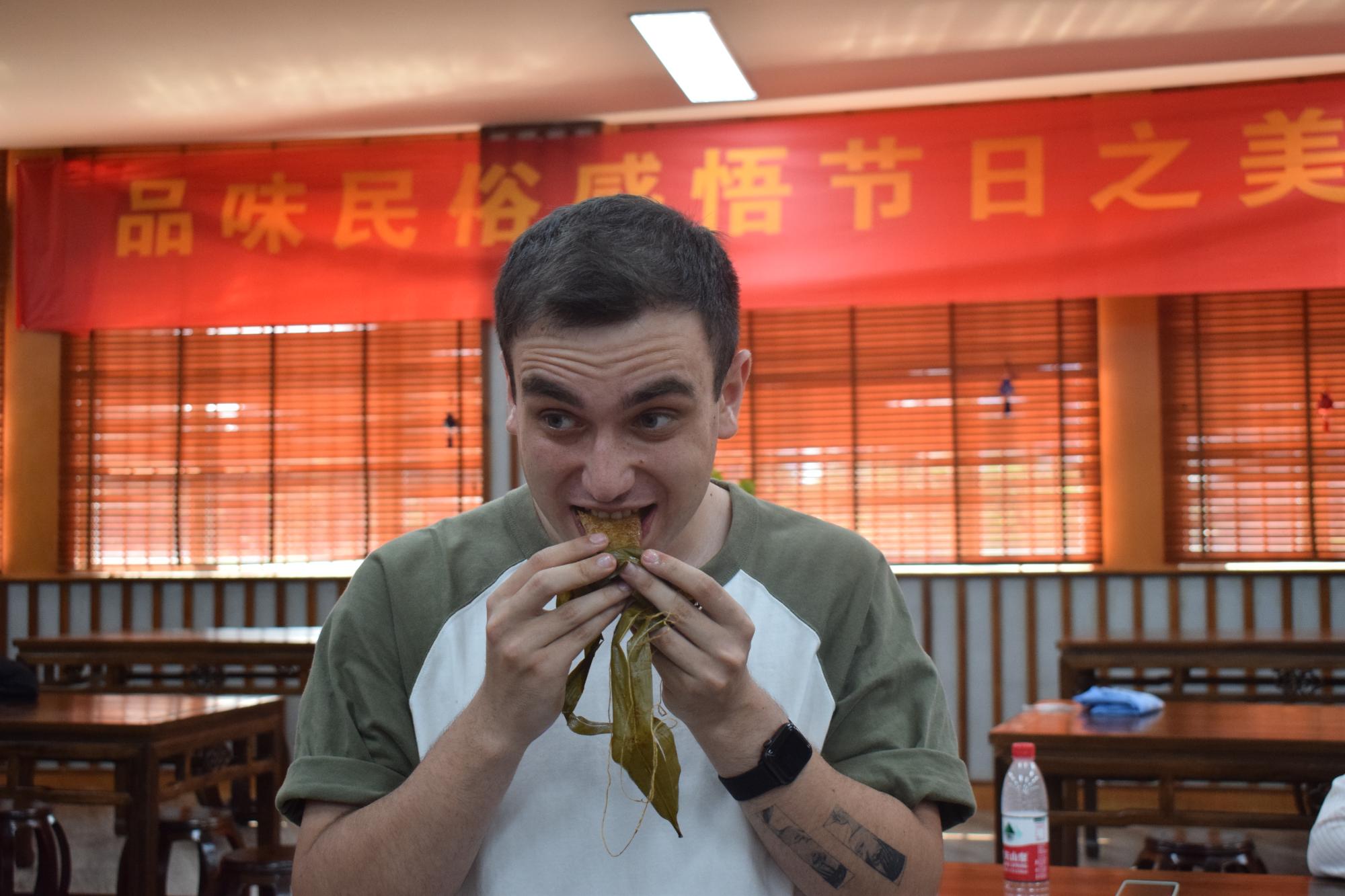 端午节少不了粽子,通过视频播放及支部成员现场展示,中外学生共同协作,每个人都成功包出了粽子。一位来自哈萨克斯坦的学生说:“这是我第一次包粽子,我很开心,谢谢你们让我在这里感受到了关怀和温暖。”
