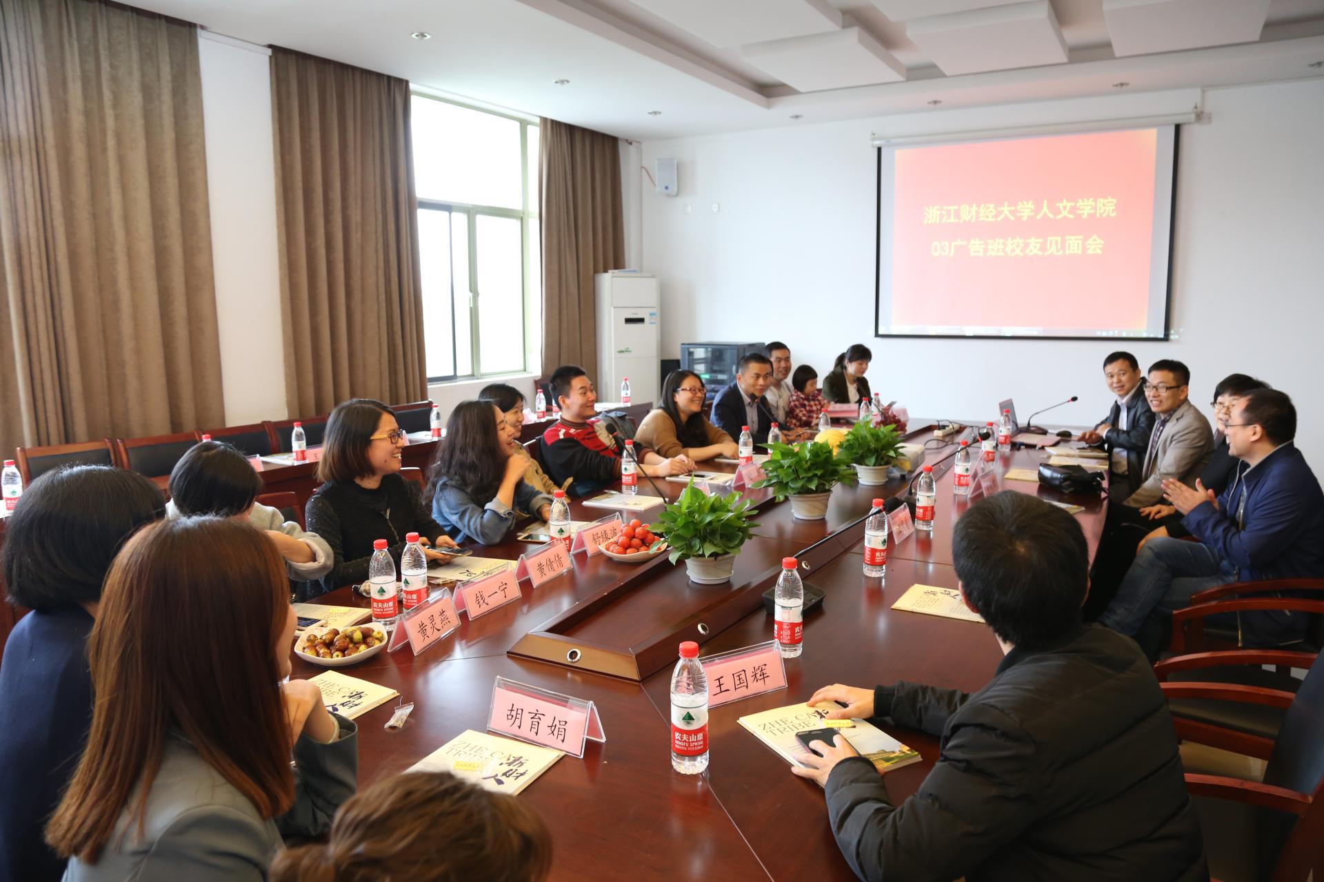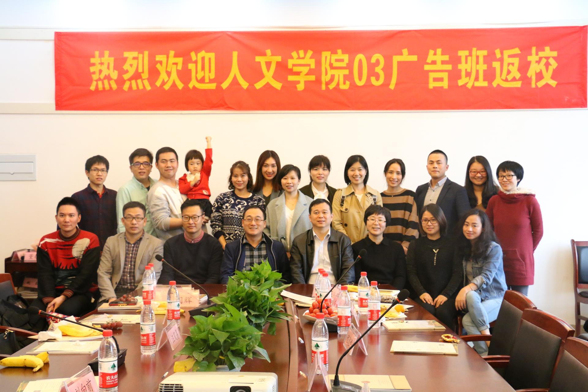 10月29日下午,人文与传播学院03广告班校友回母校聚会,并在学院楼404会议室召开座谈会,校友和在校师生齐聚一堂,共叙师生情谊,齐愿母校繁荣。03广告班的原带班辅导员、现数科学院党委副书记刘向前和现学生处干部汪风易特邀出席,人文与传播学院党委副书记吴玻、数字媒体艺术系系主任王文奇、校友联络员章立峰和03级广告班校友参加。
