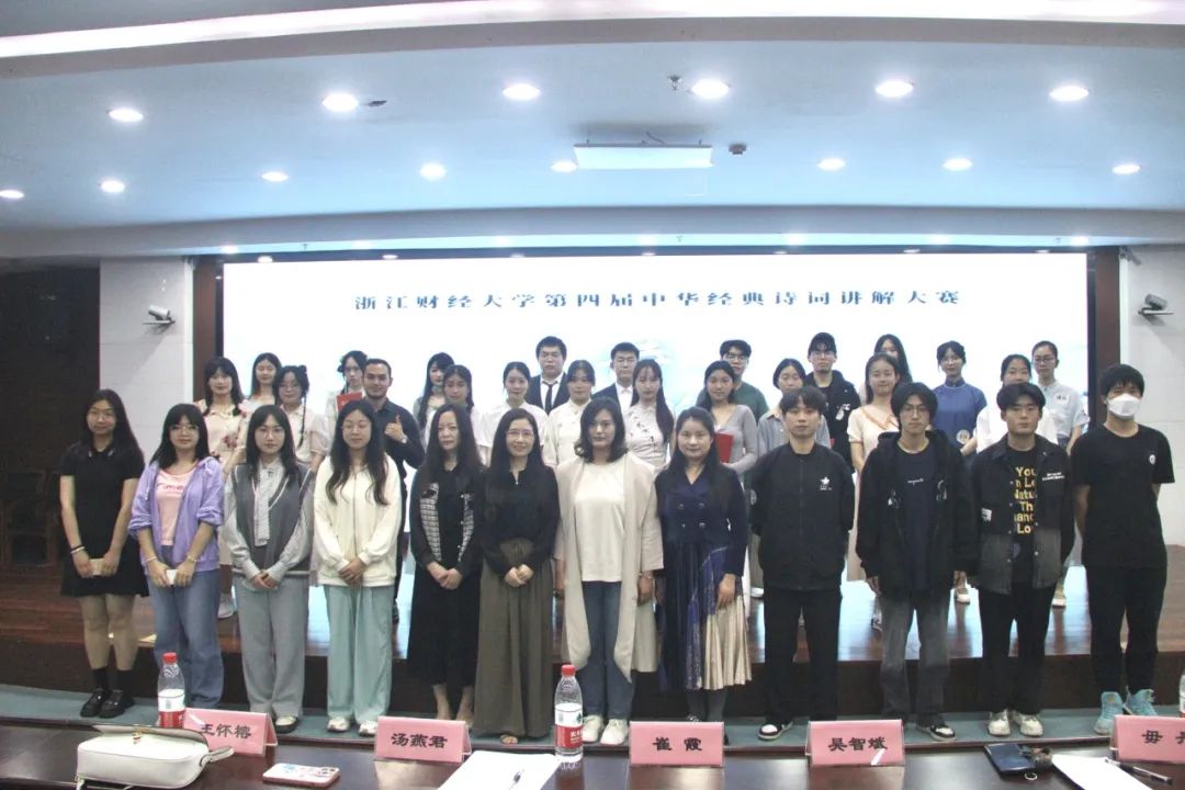 海以博大而浩瀚,山以厚重而雄浑,中华诗词以其发人深省的思想、底蕴深厚的内涵与烛照千古的魅力而源远流长。诗词讲解,透过韵律文墨触碰千年前士子骚客们的灵魂,再现风流儒雅的文人风骨,使其古为今用,启智润心。4月28日下午,浙江财经大学第四届中华经典诗词讲解大赛决赛于学术四报顺利举办,人文与传播学院崔霞老师、吴智斌老师、毋丹老师、汤燕君老师、王怀榕老师出席了本次比赛并担任评委。