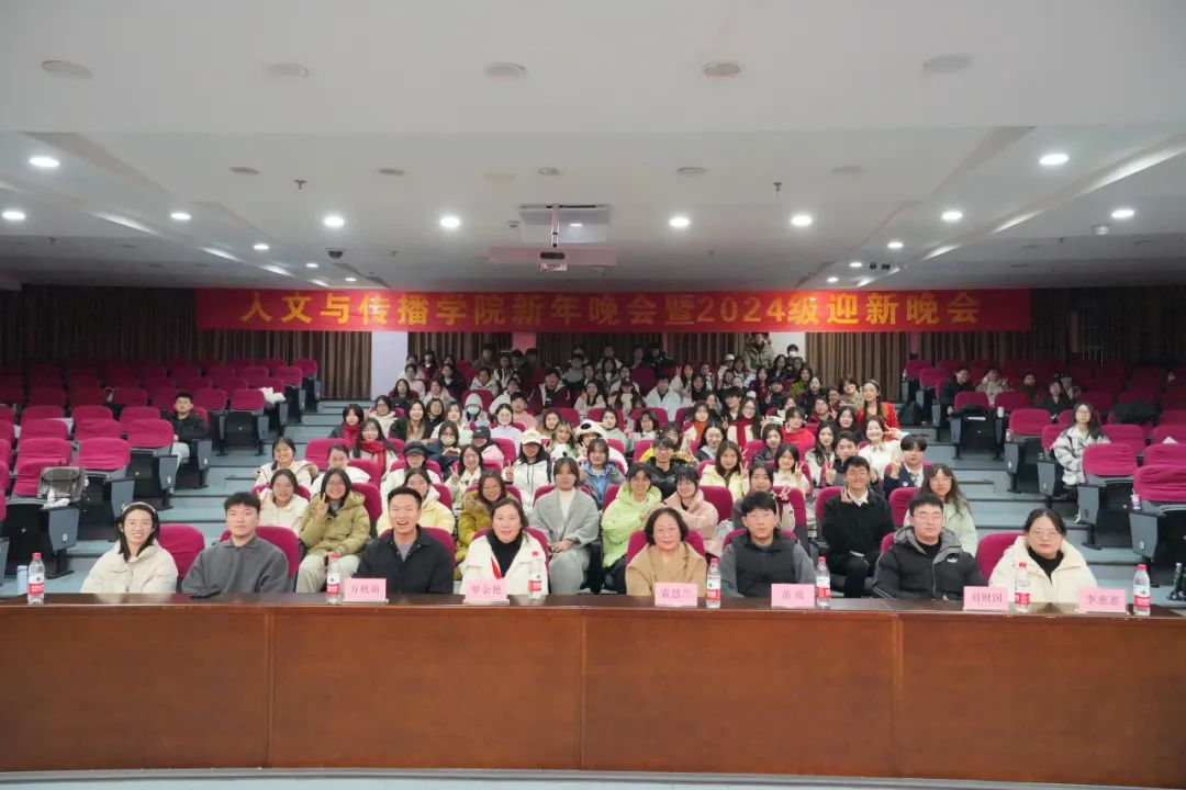 2024年12月29日晚,人文与传播学院2025年新年晚会暨2024级迎新晚会在学术四报隆重举行。人文与传播学院党委书记罗金艳,副书记袁慧兰,24级新生班主任代表董政,辅导员万秋萌、李惠惠、陈琛、刘财国、徐沛村及2024级新生参加。