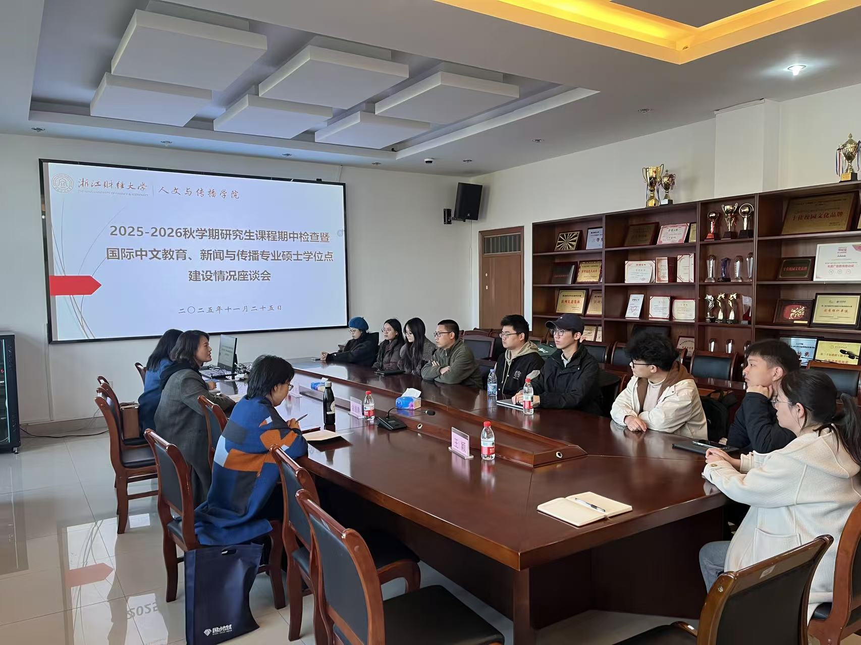 根据学校2025-2026学年秋学期研究生课程期中考核和教学检查的工作安排,我院于11月25日下午16:00在学院楼404会议室召开本学期的研究生座谈会。本次座谈会邀请到了研究生院督导余清萍教授,学院分管领导毋丹副院长参加并主持本次座谈会,国际中文教育负责人付伊副教授、新闻与传播专业硕导王颖副教授、研究生秘书以及学院24、25级各专业研究生代表20余人参加了座谈会。